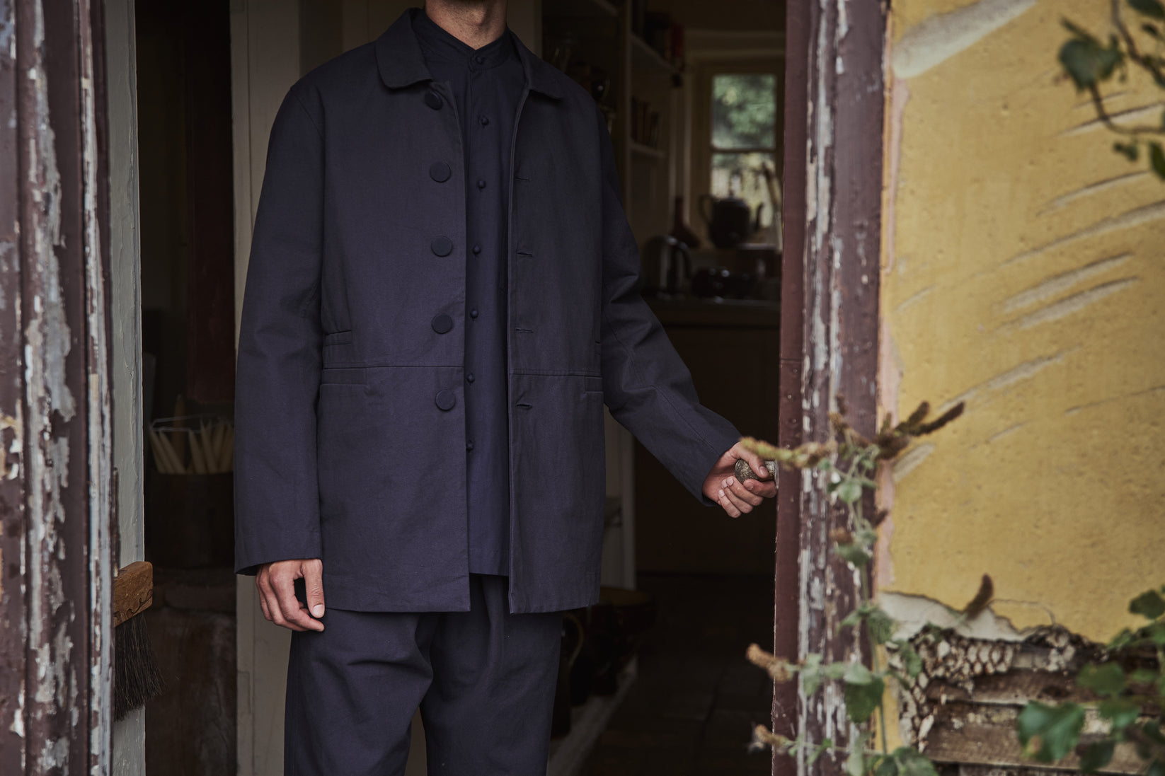 mens boxy jacket, double concealed front pockets, mid waist seam, soft collar