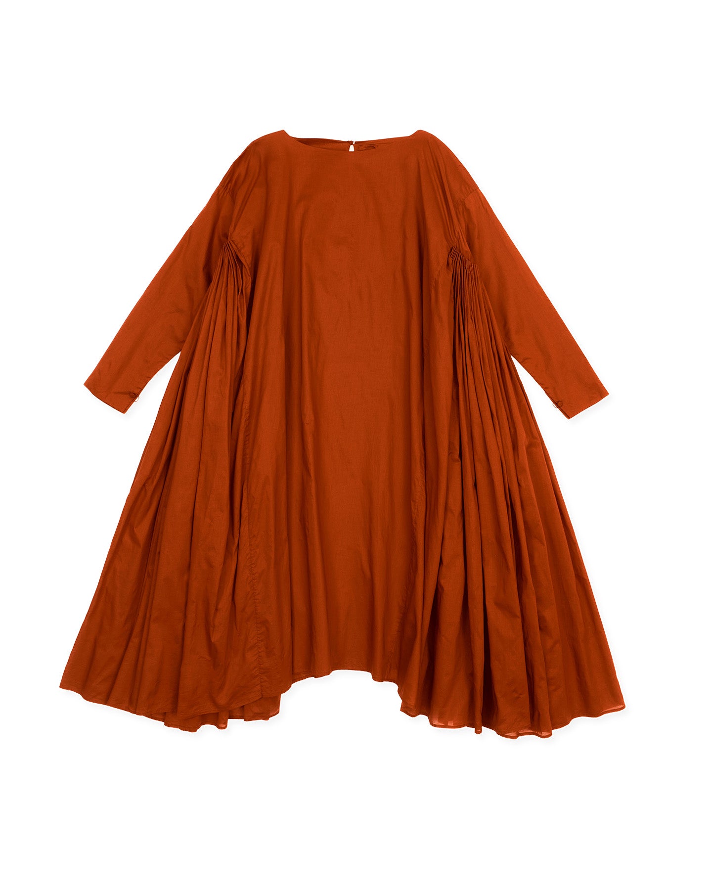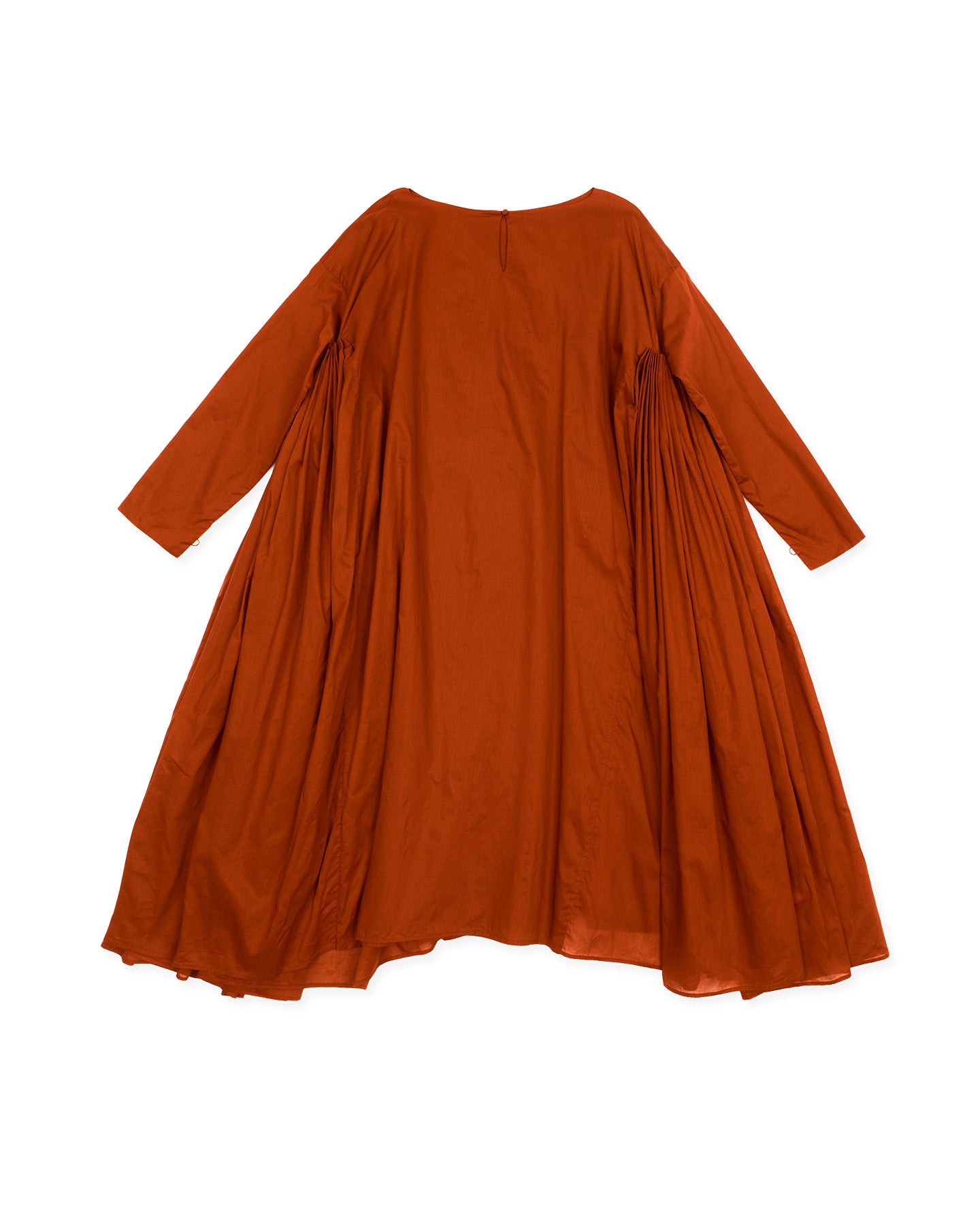 mid length dress, gathers under arm, boat neck, button wrist fastening