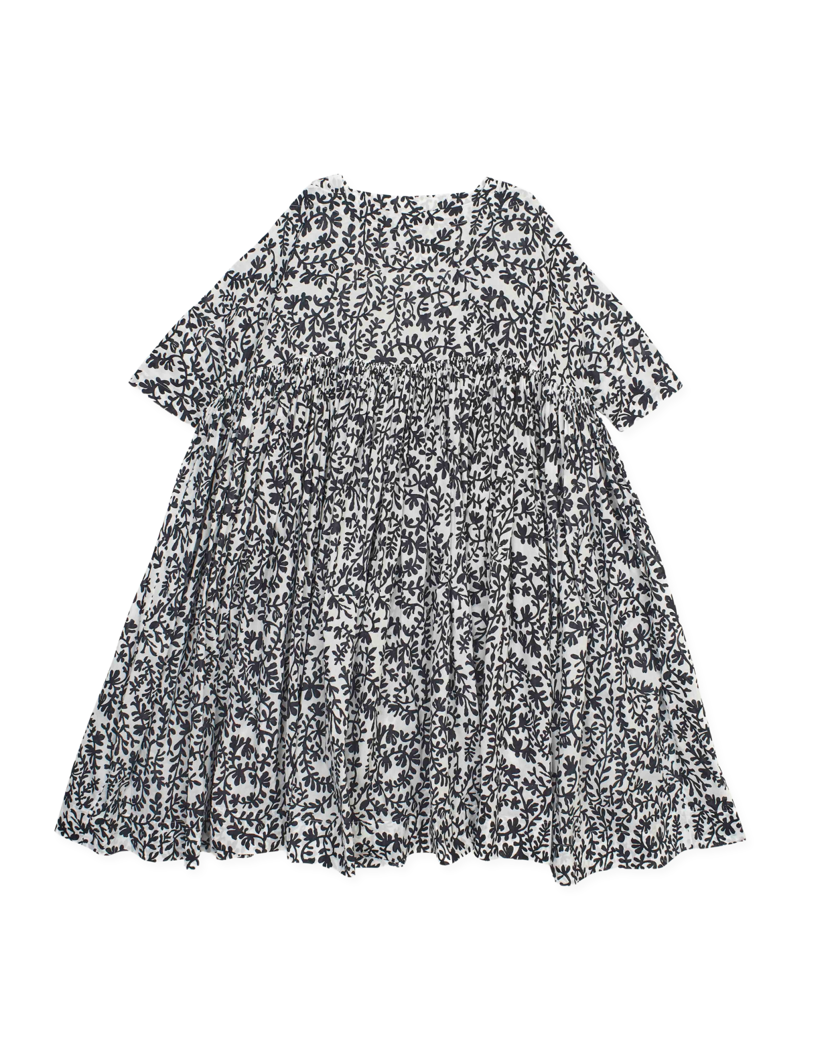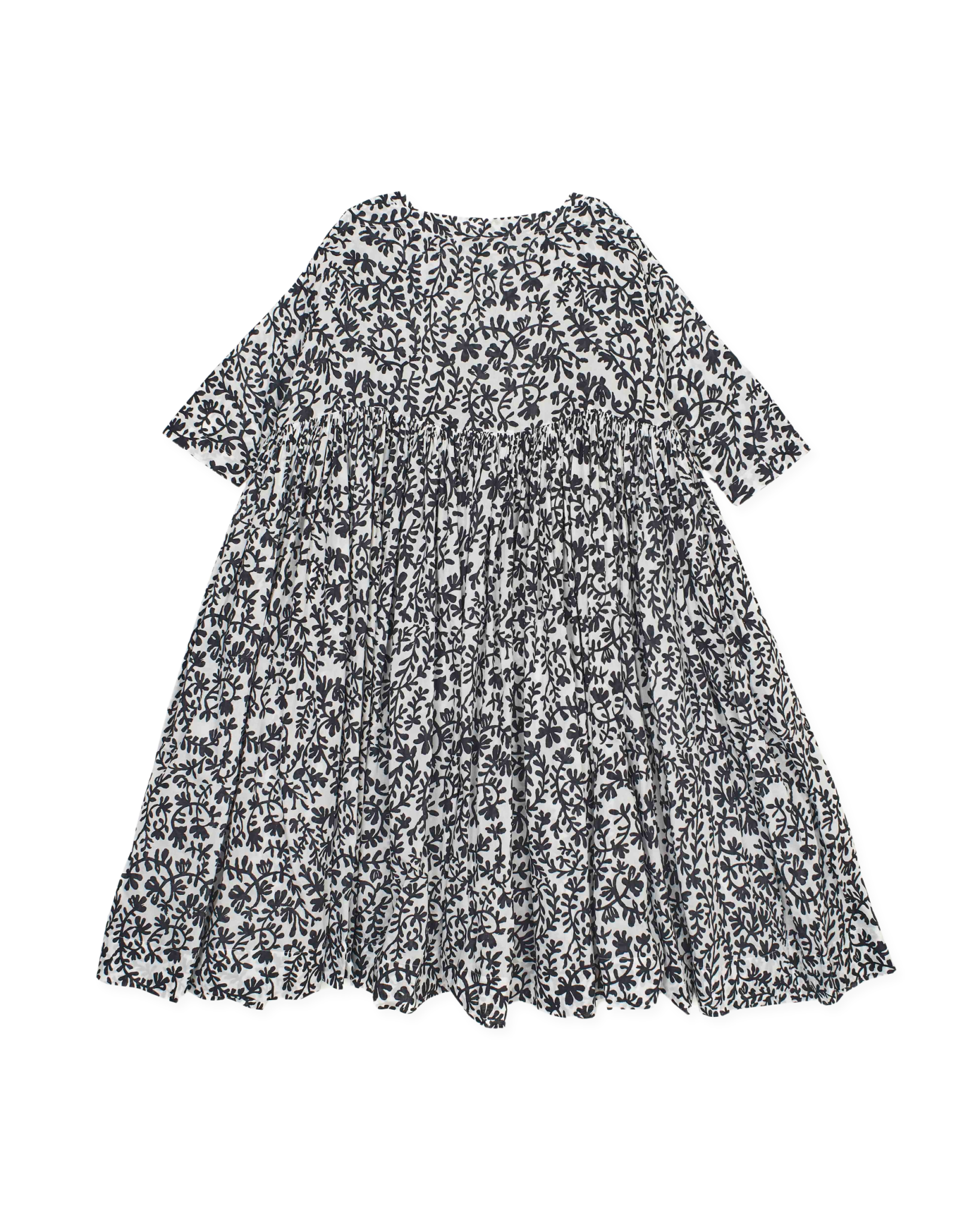 ruffled full length dress, boat neck, elbow length sleeves, full skirt