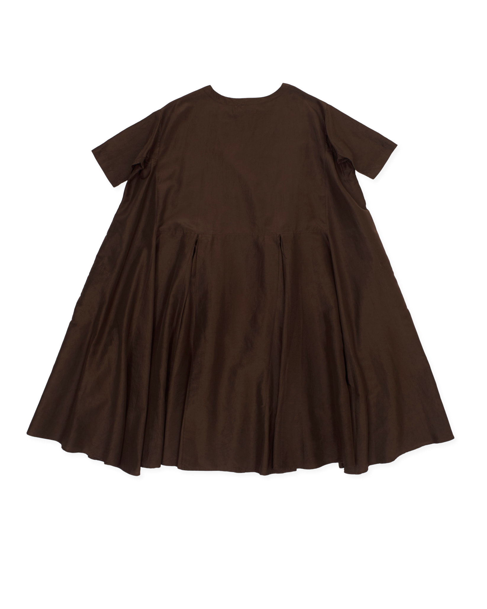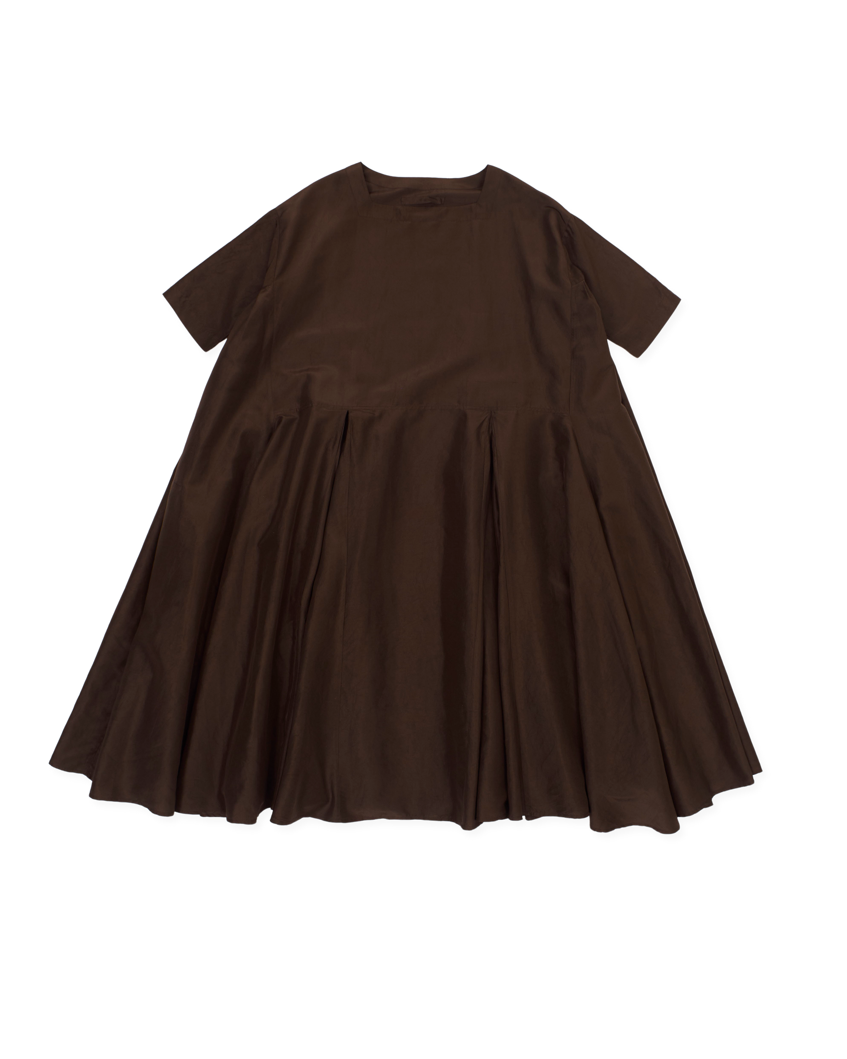hazelnut voluminous dress, short sleeves, square collar, deep pleated skirt