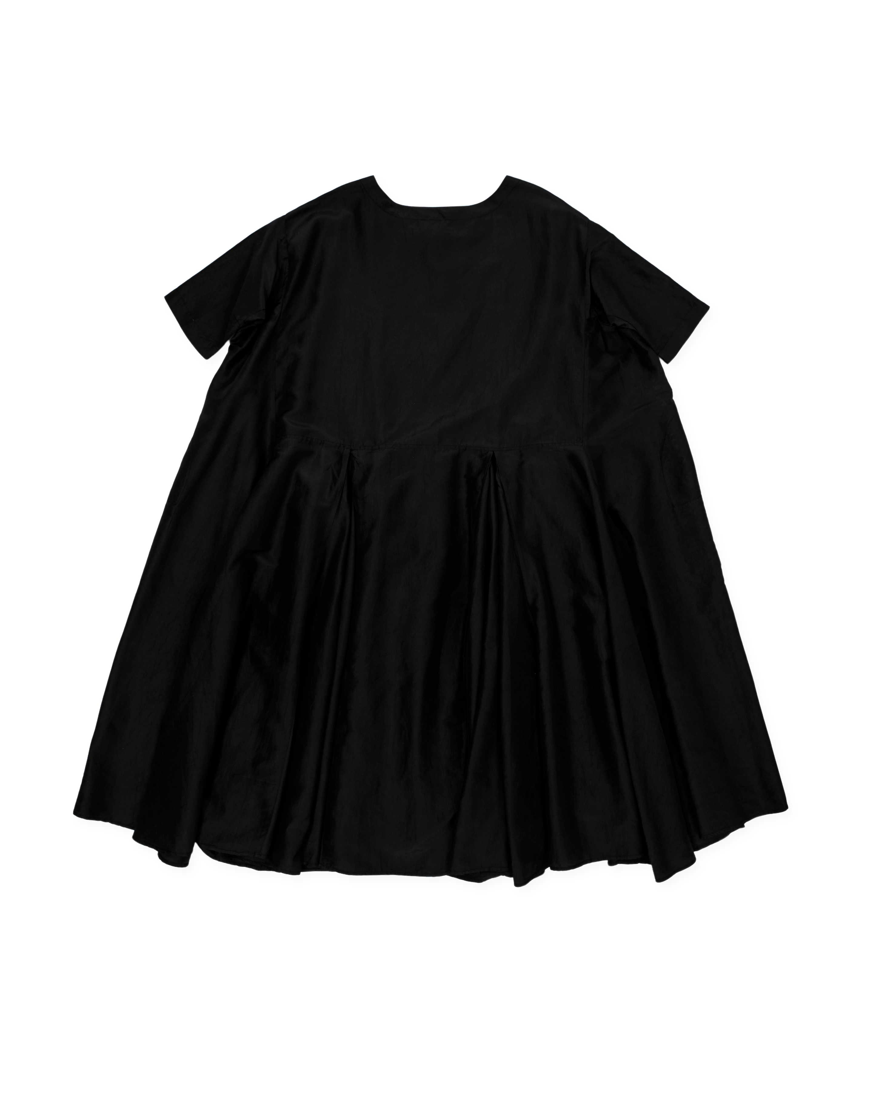 voluminous dress, short sleeves, square collar, deep pleated skirt