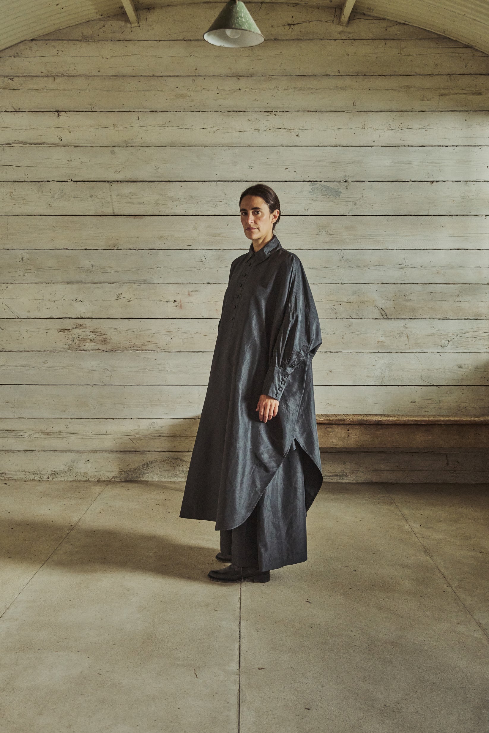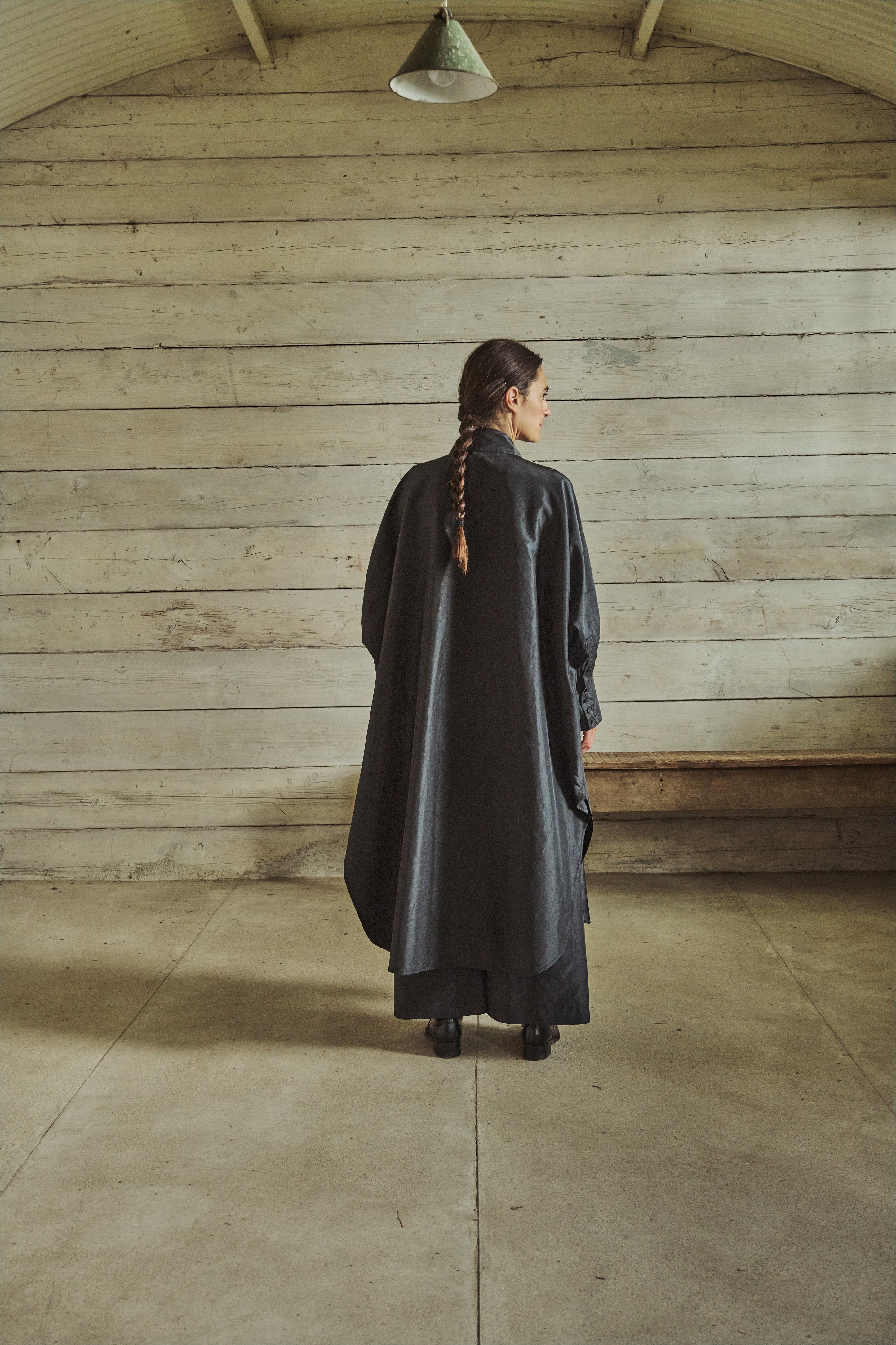 oversized shirt, wide cut, tapered sides, slant front pockets