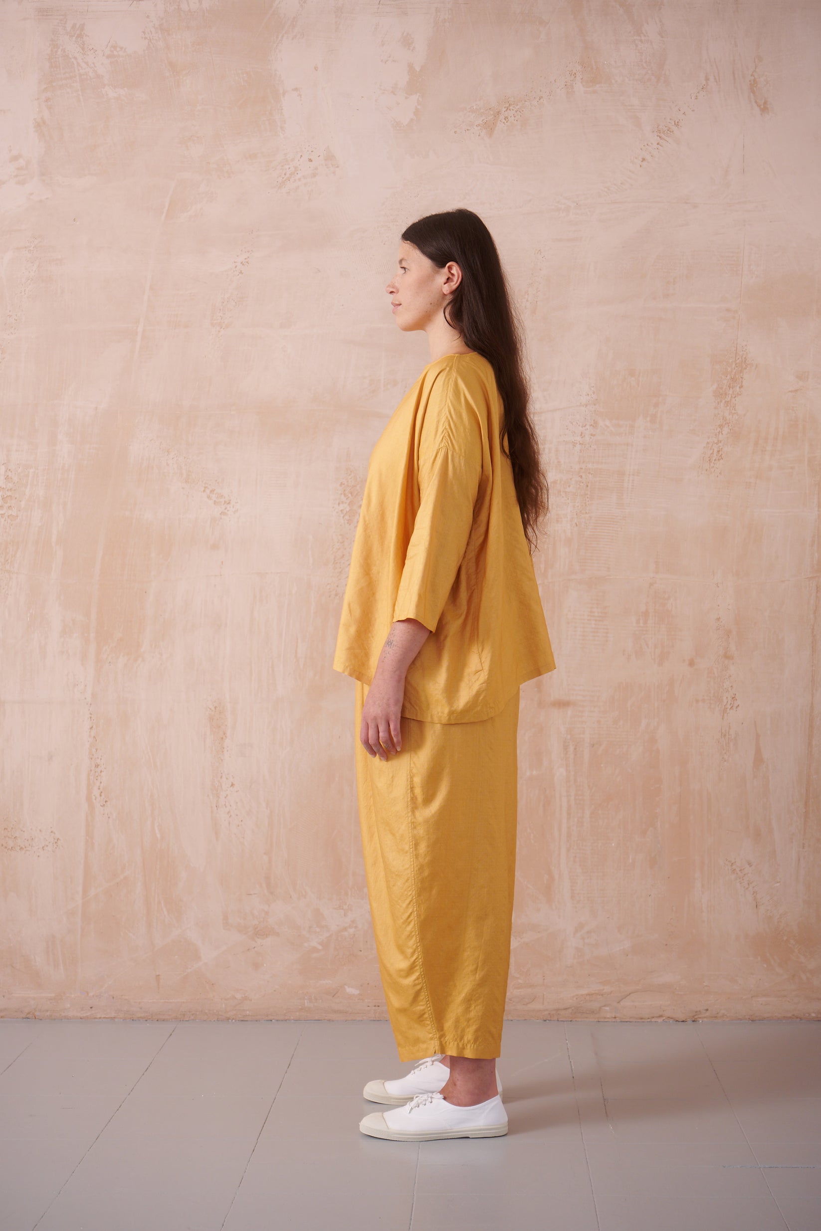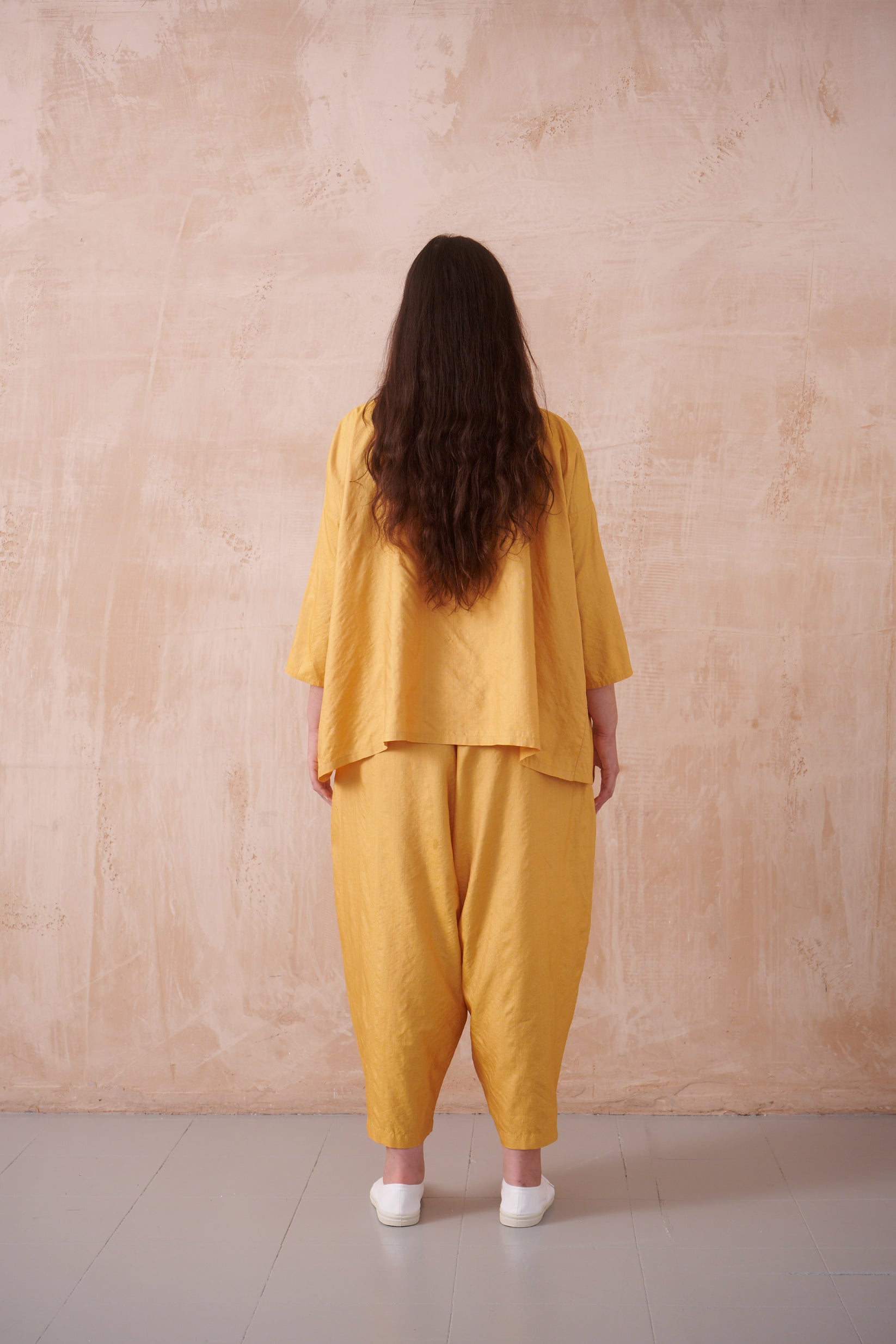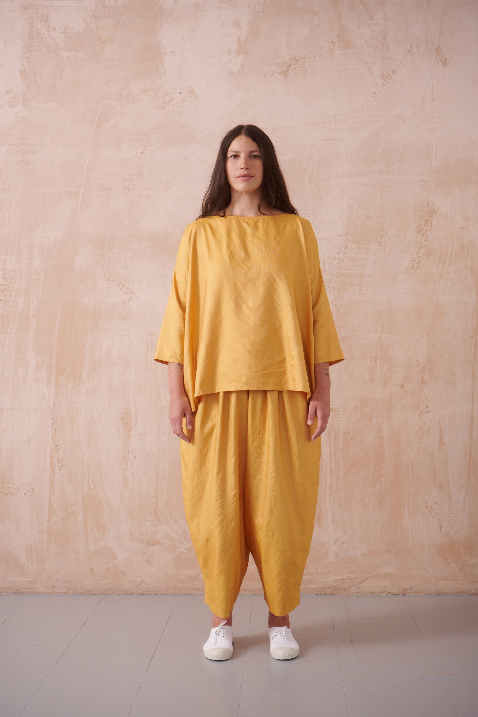 inverted pleat baggy pant, tapered leg, elasticated waist with drawstring,