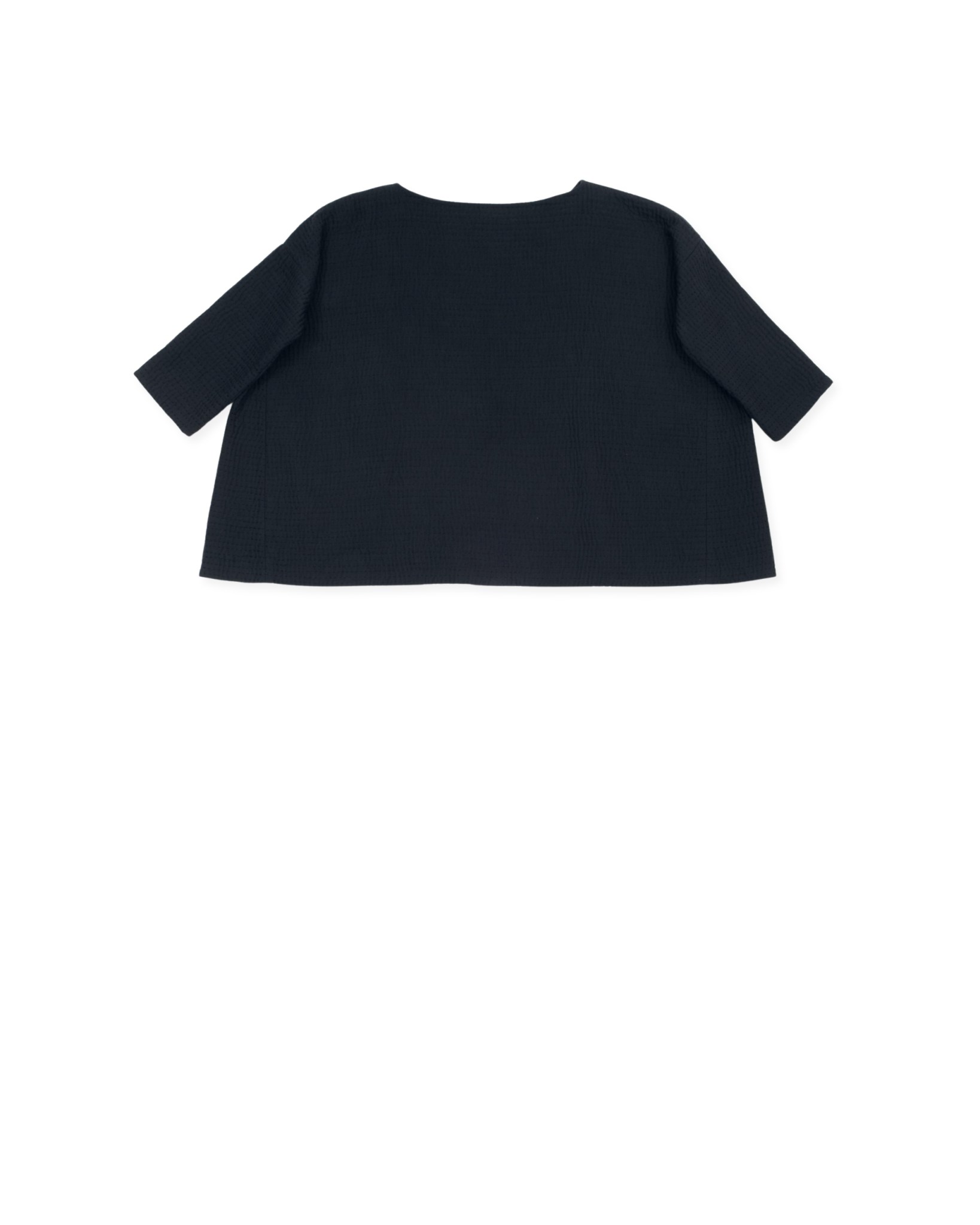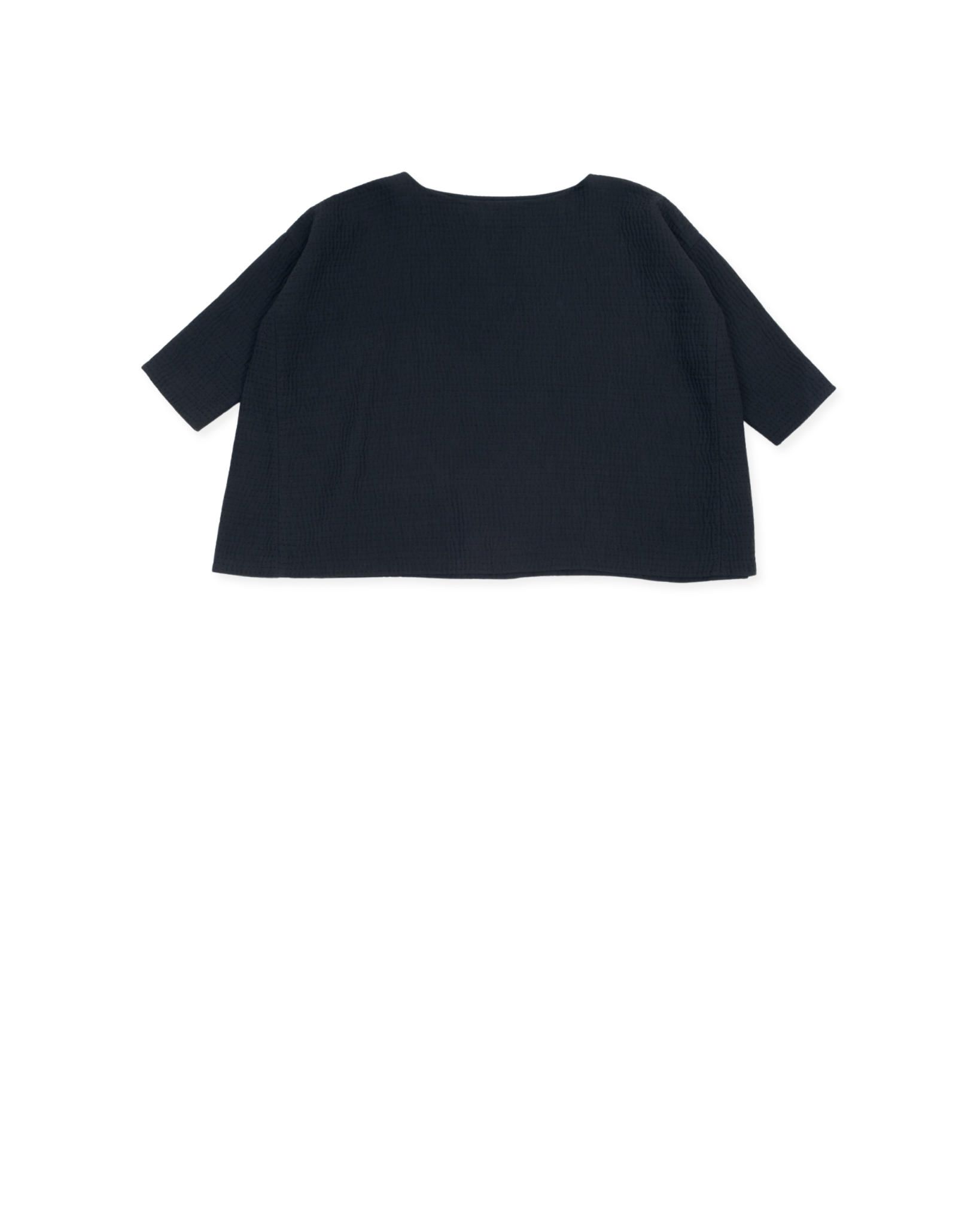 rectangle cut t-shirt, boatneck collar, back button fastening, side panel