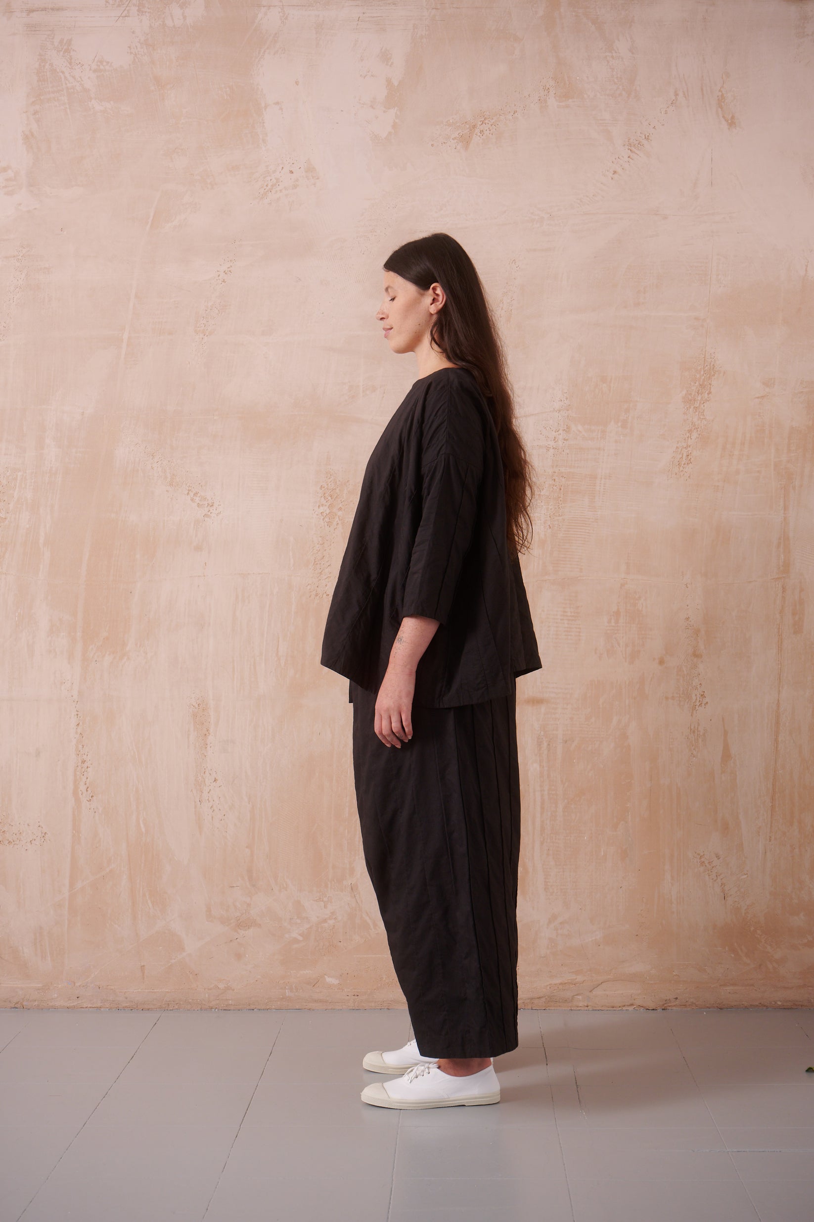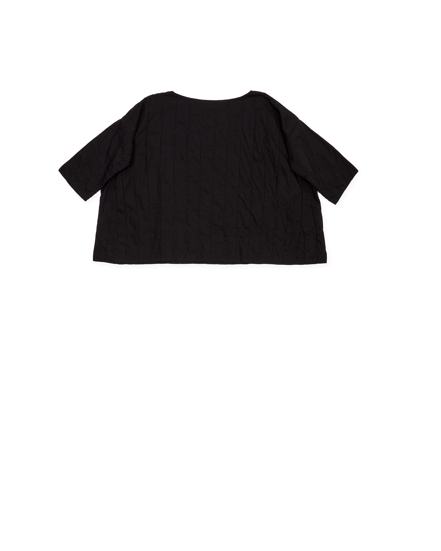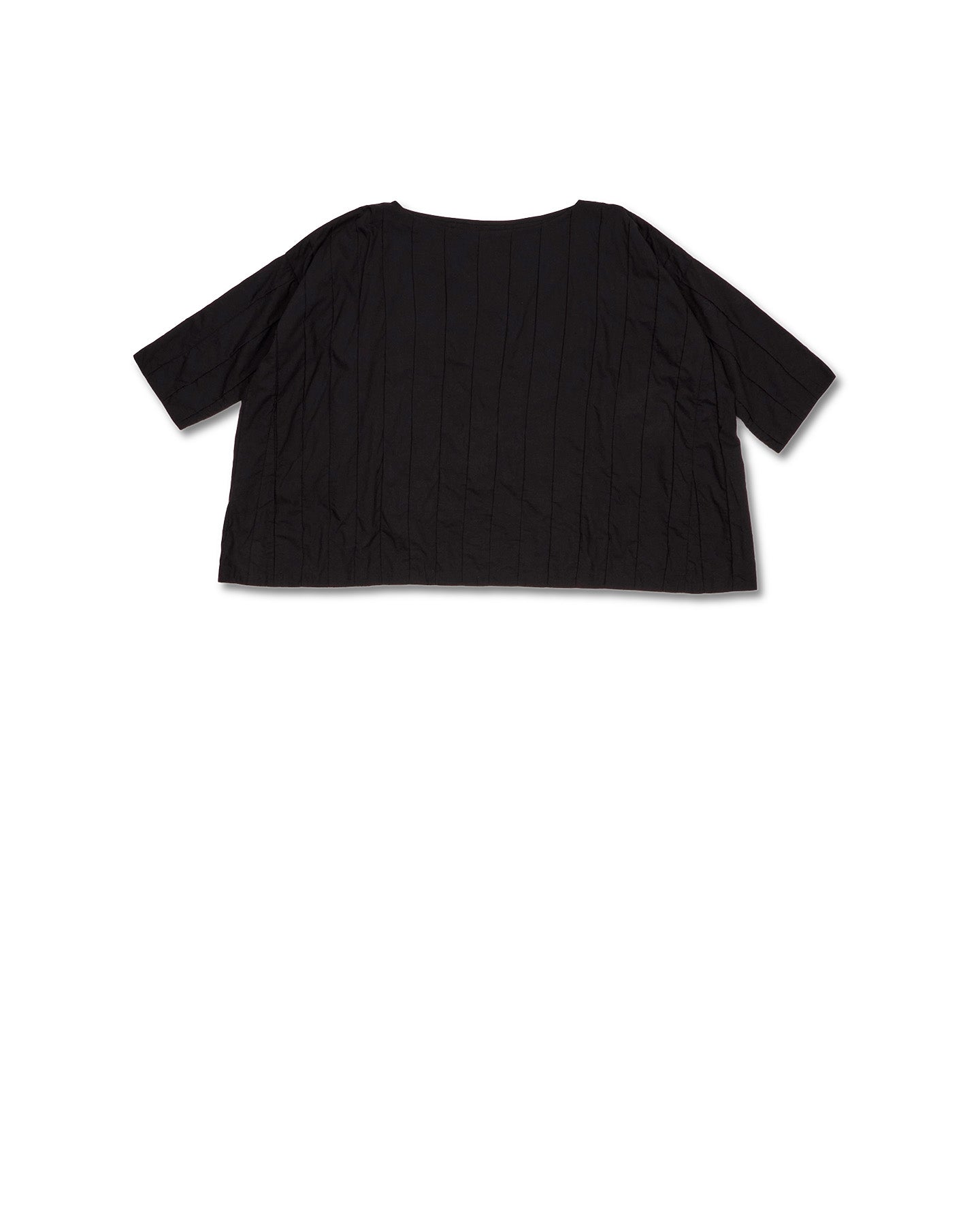 rectangle cut t-shirt, boatneck collar, back button fastening, side panel