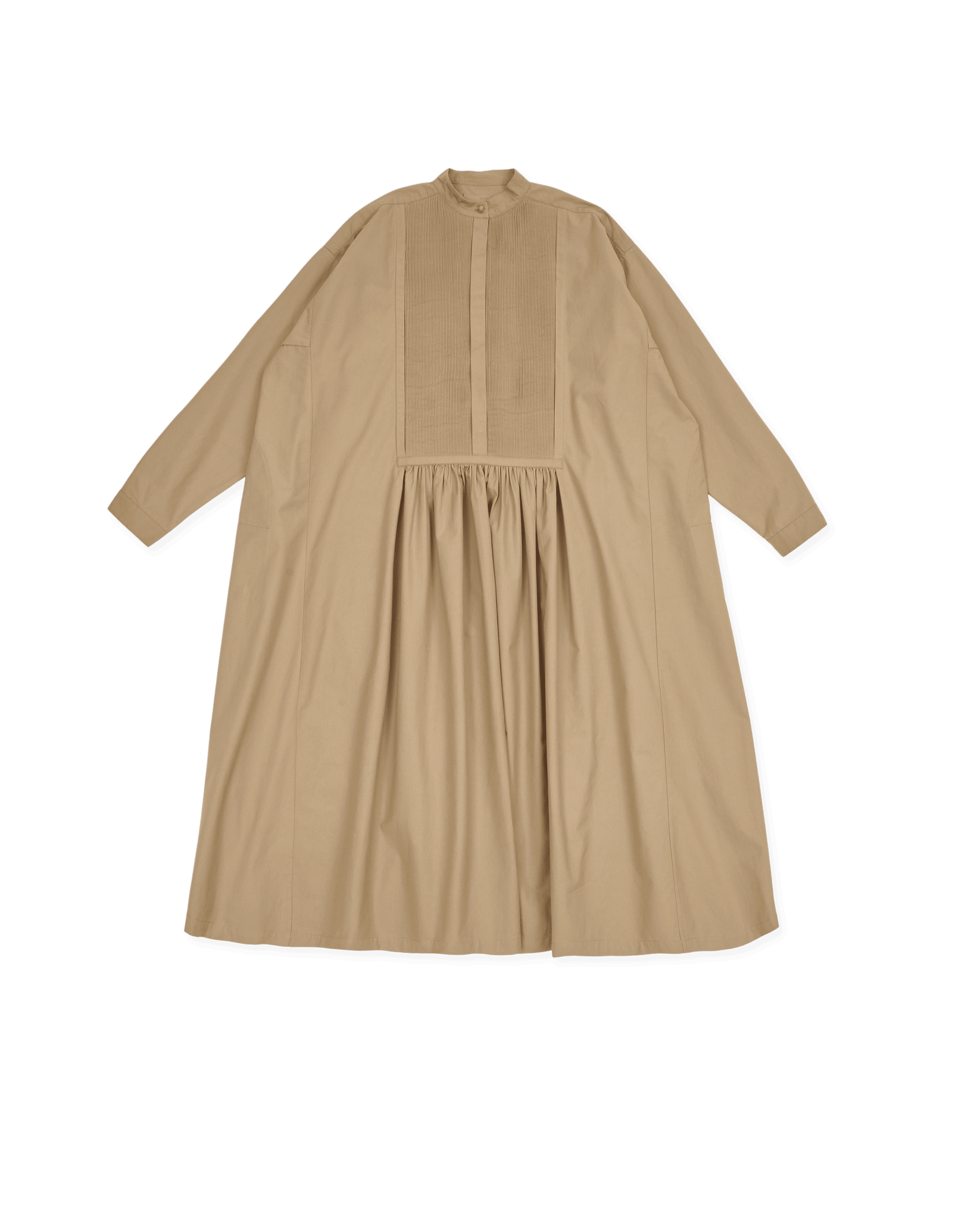 long sleeved dress, pin tuck bib front, buttoned cuffs, side seam pockets