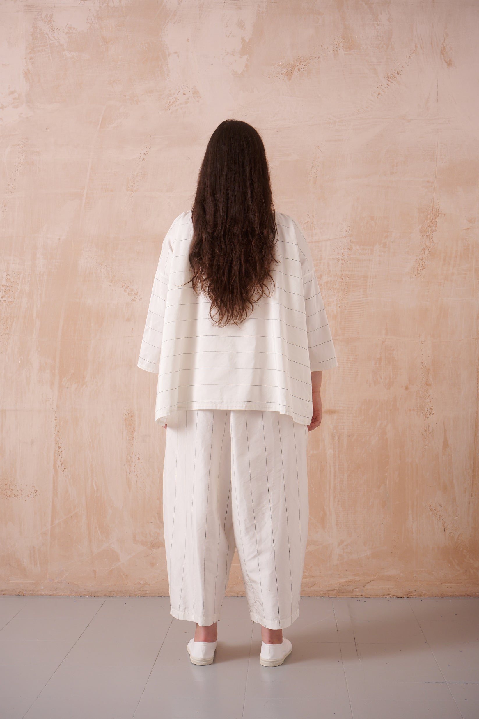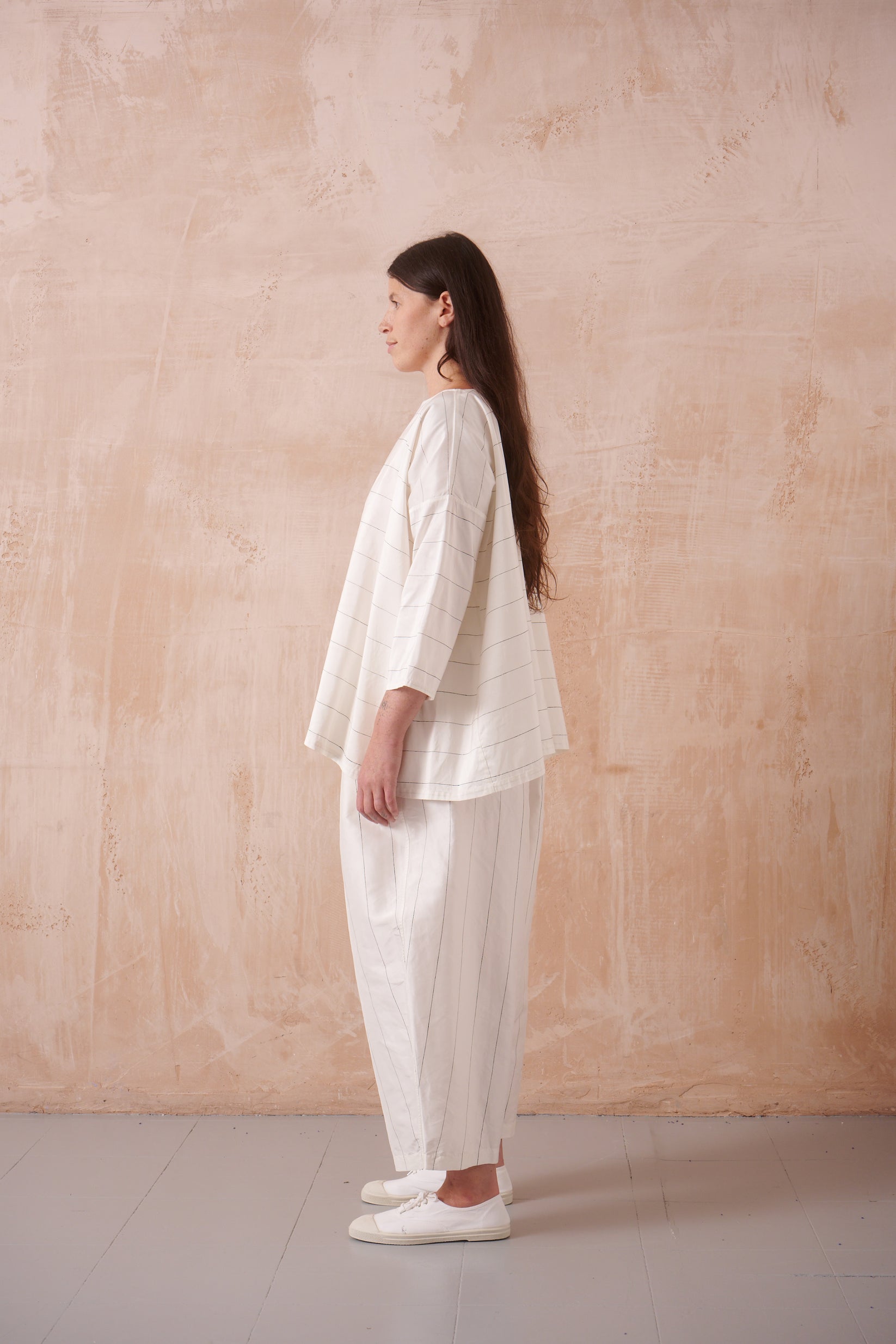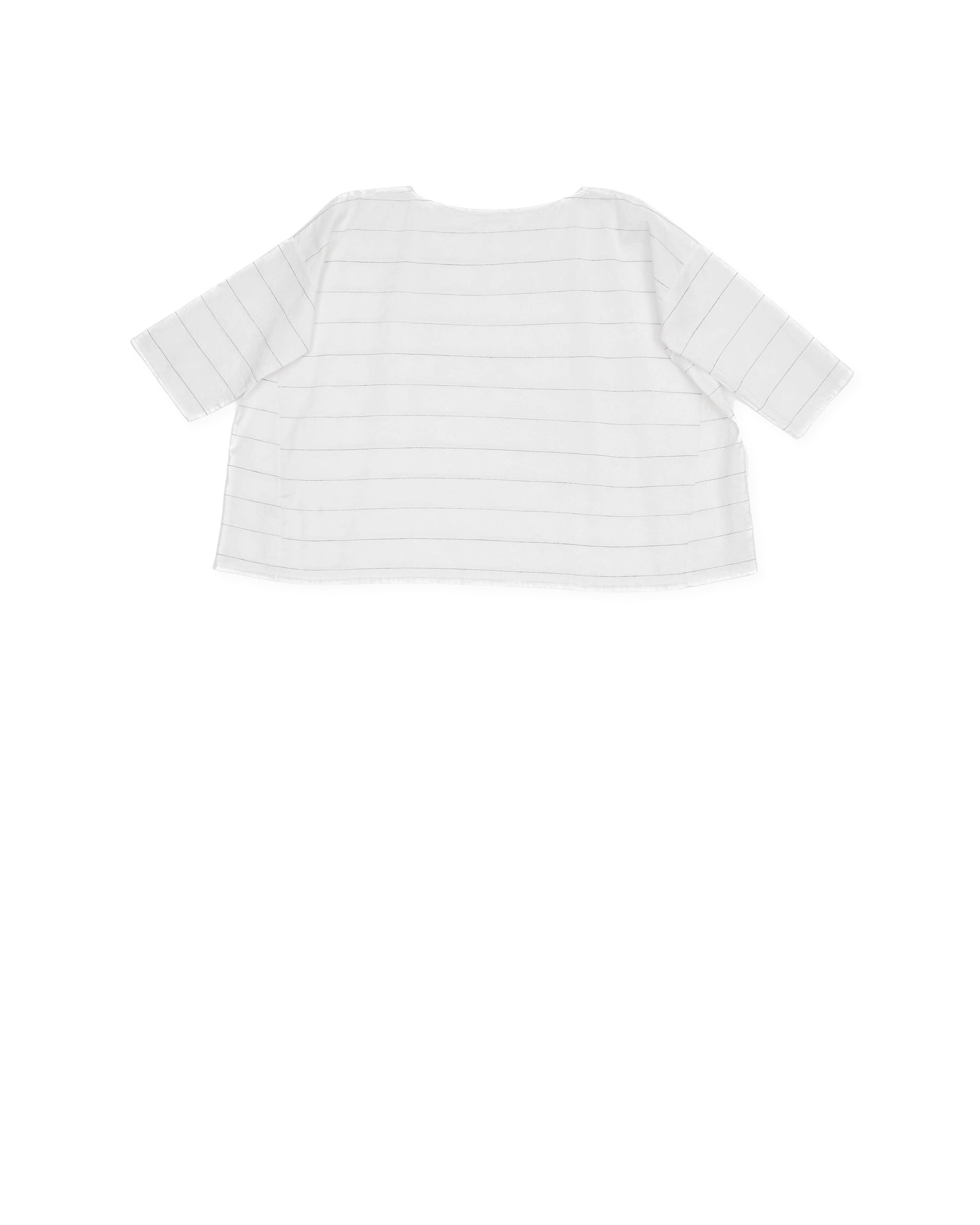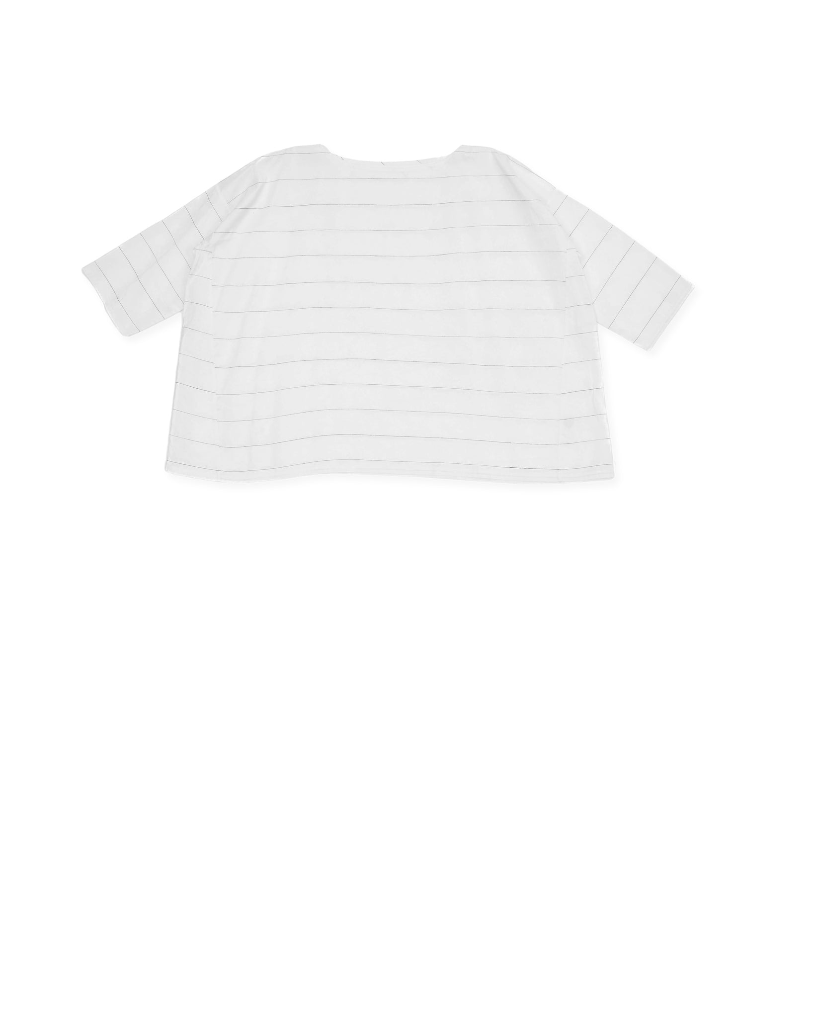 rectangle cut t-shirt, boatneck collar, back button fastening, side panel